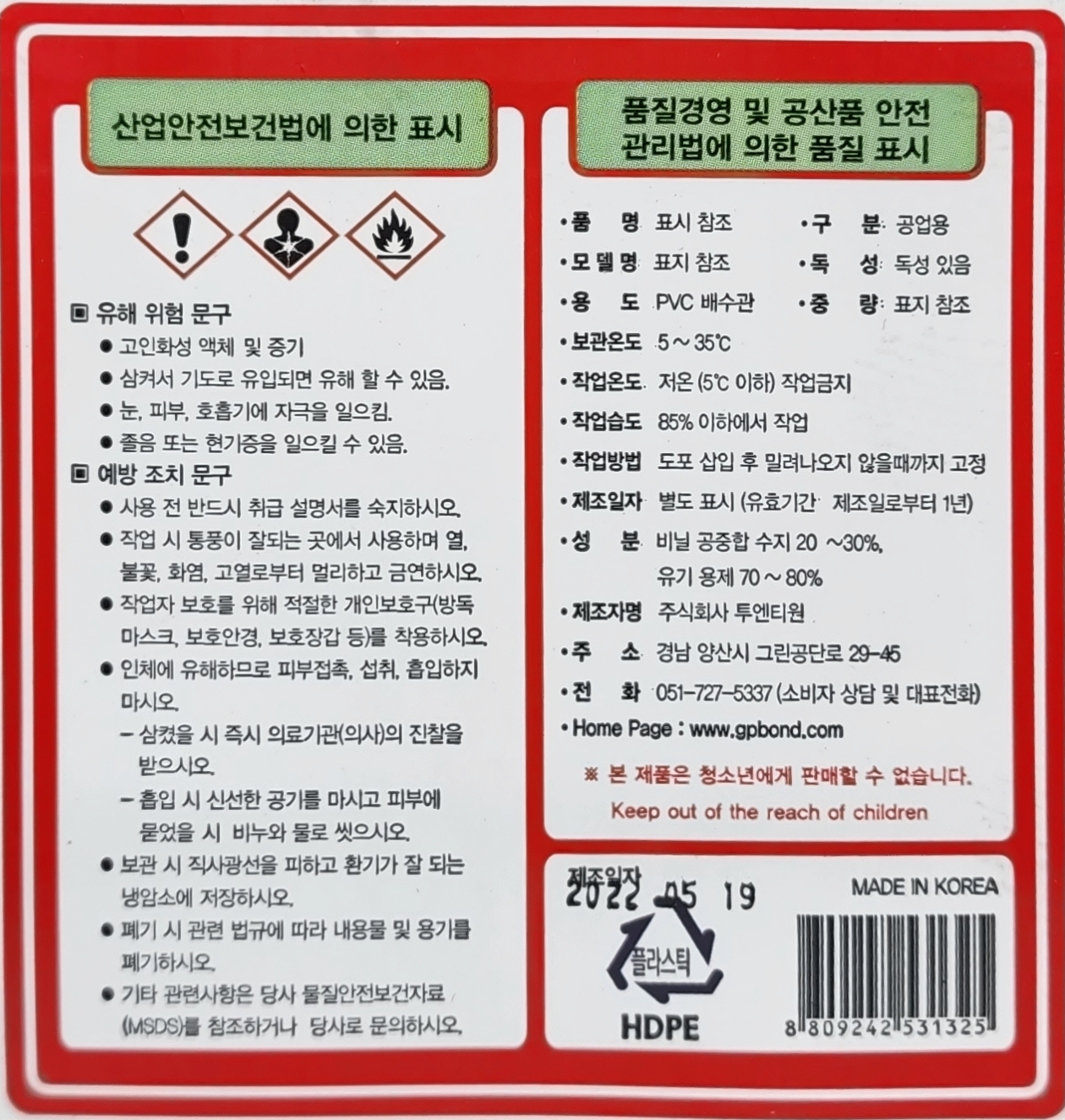 눈에 띄는 청색 PVC 본드 작업시 본드를 사용여부가 헷갈리는 경우가 있으셨을텐데요. 이제는 그런 걱정 없이 청색의 PVC 본드를 이용해보세요. | ||||||